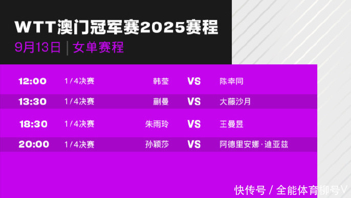 北京技能9月13日音讯,2025年WTT澳门冠军赛不竭进行,CCTV5、CCTV5+全程直播。女单1/4决赛,天下第一“小魔王”孙颖莎对阵波多黎各选手阿德里安-迪亚兹,天下第二“鳗鱼”王曼昱对阵前天下第一朱雨玲,她在1/8决赛以3-2逆转老敌手早田希娜。
